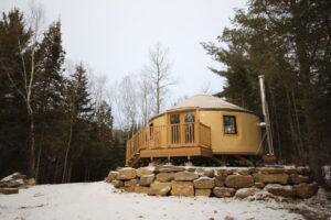 Cette yourte, également de 20 pieds de diamètre, doit son nom au fait que les chevreuils viennent s’abreuver à la petite cascade du ruisseau située à gauche de l’emplacement.